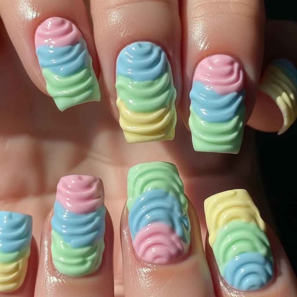 This trend is as delicious as it sounds. Inspired by cake frosting, it features soft, swirling blends of pastel colors that look just like buttercream icing. Think mint green swirling into baby pink and sky blue.
