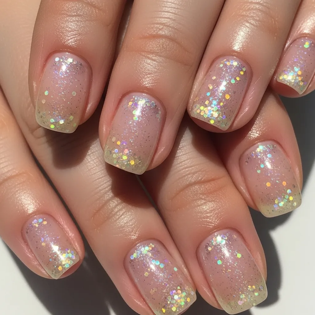 Use a clear or sheer pink base and gently press on just a few pieces of fine holographic or iridescent glitter. Don’t cover the whole nail—let it be random and sparse. It’s subtle magic for everyday wear.