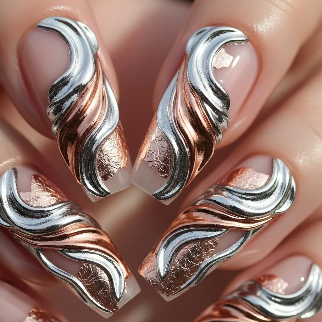 Picture a thin, delicate line of metallic foil or polish that looks like it’s casually draped across your nail, sometimes with a little ‘drip’ effect. It’s fluid, artistic, and feels like wearable jewelry.