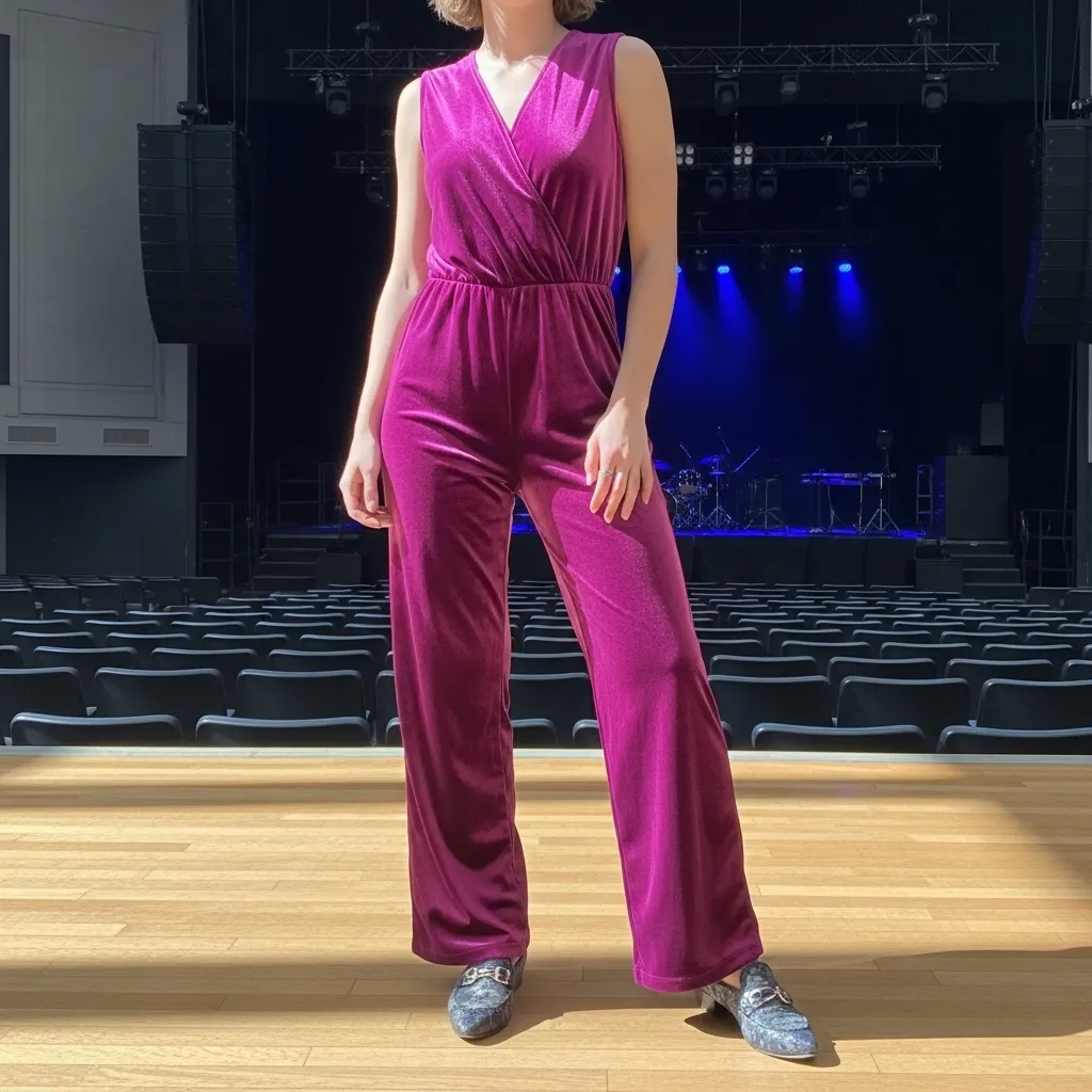 For a truly show-stopping look, go for a deep plum velvet jumpsuit. Velvet has a luxurious feel that’s perfect for an evening show, and a jumpsuit means no fussing with separates.