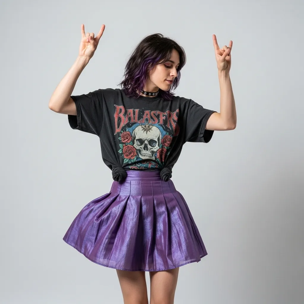 Merge fandom with fashion by tying a vintage-looking band tee at the waist. Underneath, wear a bold purple mini skirt in a satin or pleated material for a pop of color.