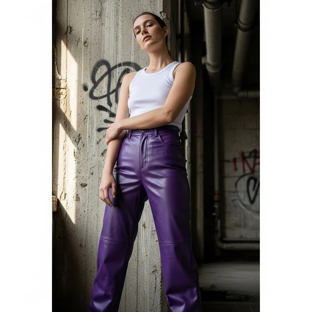 Elevate a basic black tank top with a pair of stunning purple faux leather pants. This look is all about the power of one statement piece.