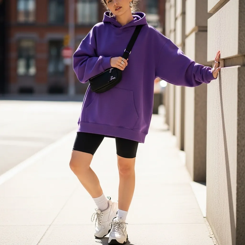 Embrace the ultimate in concert comfort with an oversized, soft violet hoodie. Pair it with black biker shorts for that classic athleisure vibe.
