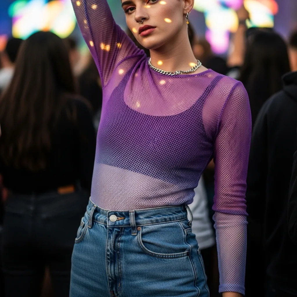 Layer a gradient purple mesh top over a black bralette or bodysuit. The mesh trend is perfect for concerts—it’s breathable, edgy, and lets you play with layers.