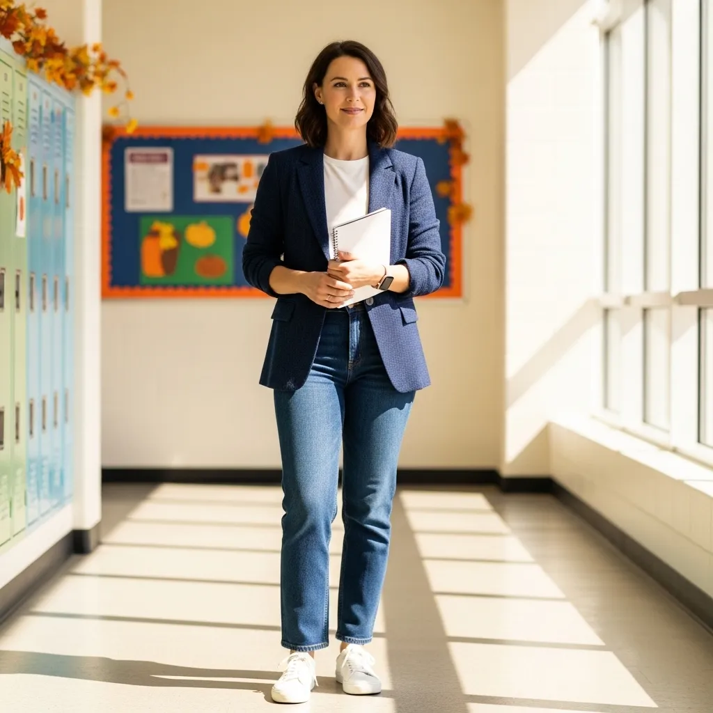 The key is in the details: choose a blazer in a stretchy fabric for movement and jeans that are comfortable enough to sit on the reading rug. Ankle-length jeans work perfectly with flats or sneakers. It’s professional enough for parent meetings but relaxed enough for a full day of teaching.