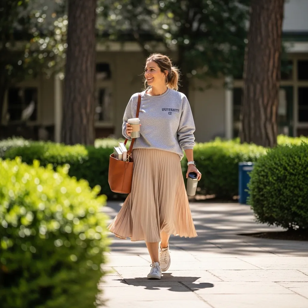 Yes, you can wear a sweatshirt to school! The trick is to balance it with a more polished bottom. I pair a clean, solid-color crewneck sweatshirt (no logos) with a pleated midi skirt or a sleek pencil skirt.