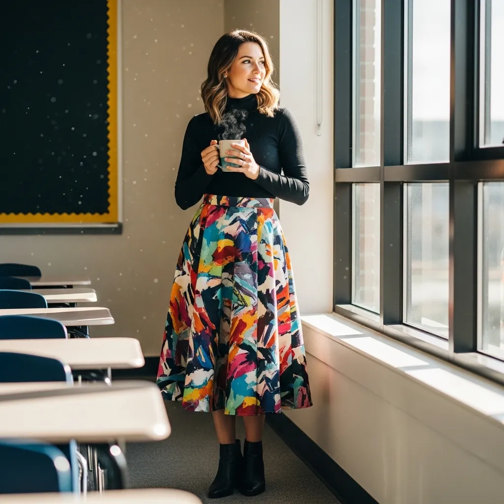 This look is perfect for navigating the temperature swings between the classroom, hallway, and playground. It keeps your core warm while giving your arms full range of motion for writing on the board.