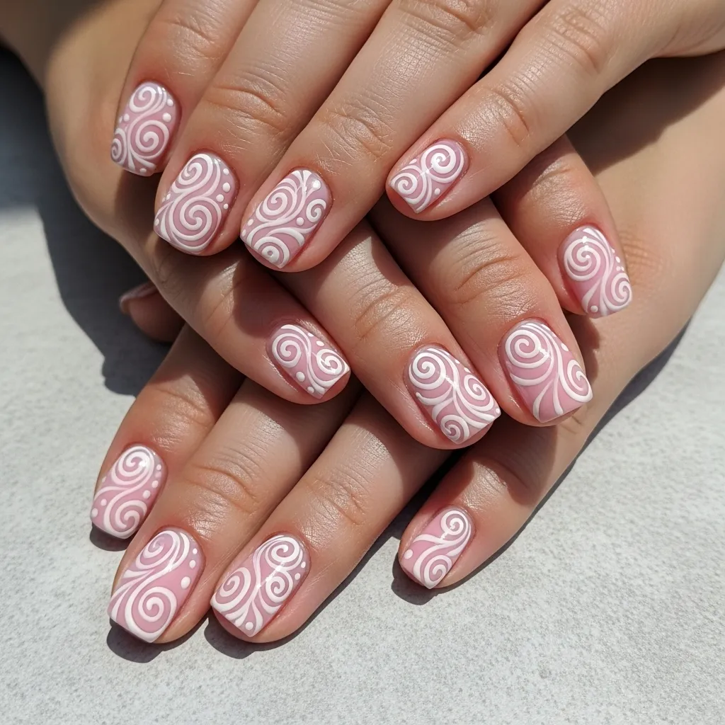 This design brings a touch of romantic, cloud-like whimsy to your fingertips. Imagine soft baby pink nails adorned with delicate, swirling white lines. It’s dainty, artistic, and oh-so-pretty.