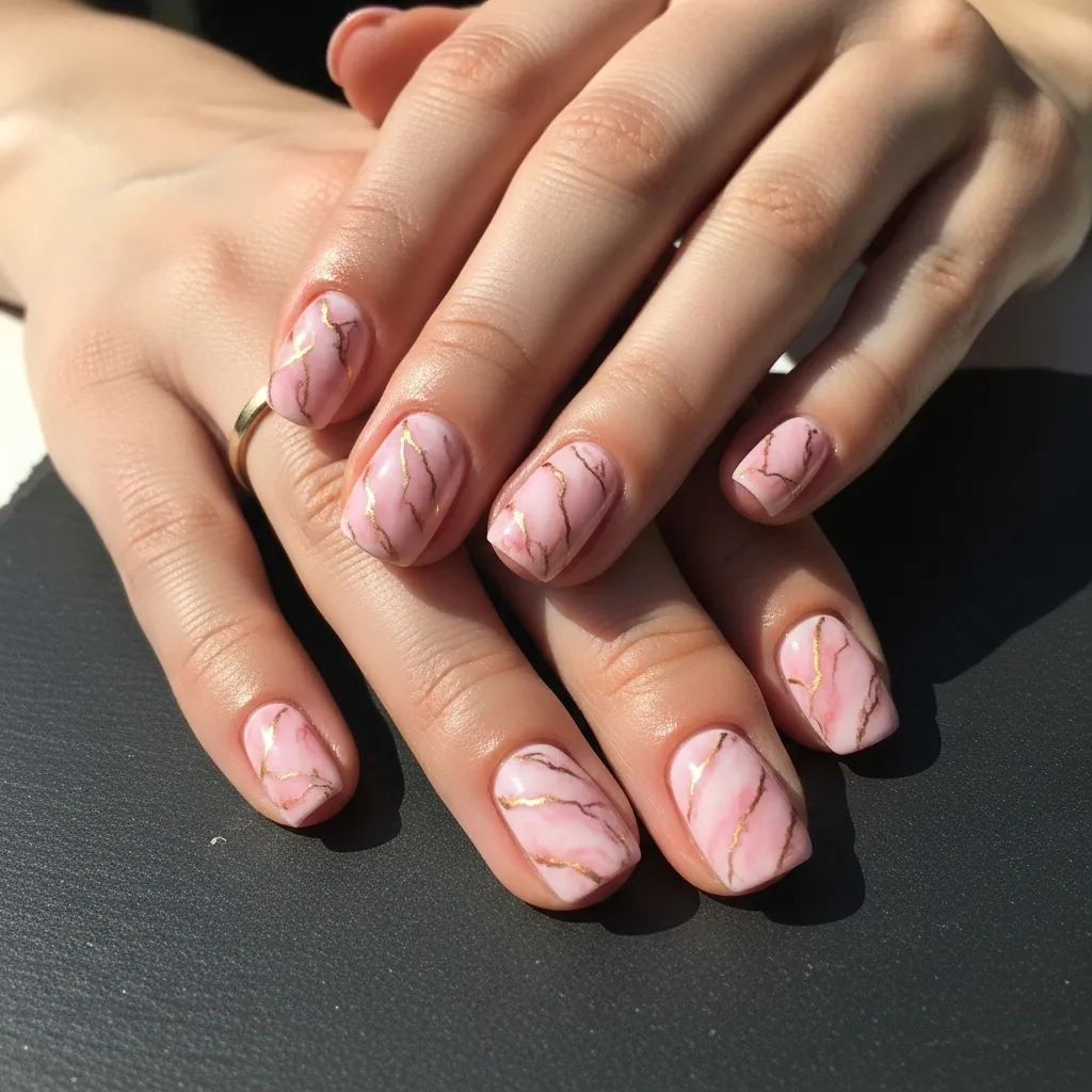 Elevate your pink mani with a luxurious marble effect. Swirls of slightly deeper pinks and whites, threaded with delicate gold veins, create a stunning, stone-like appearance. It looks intricate and expensive.