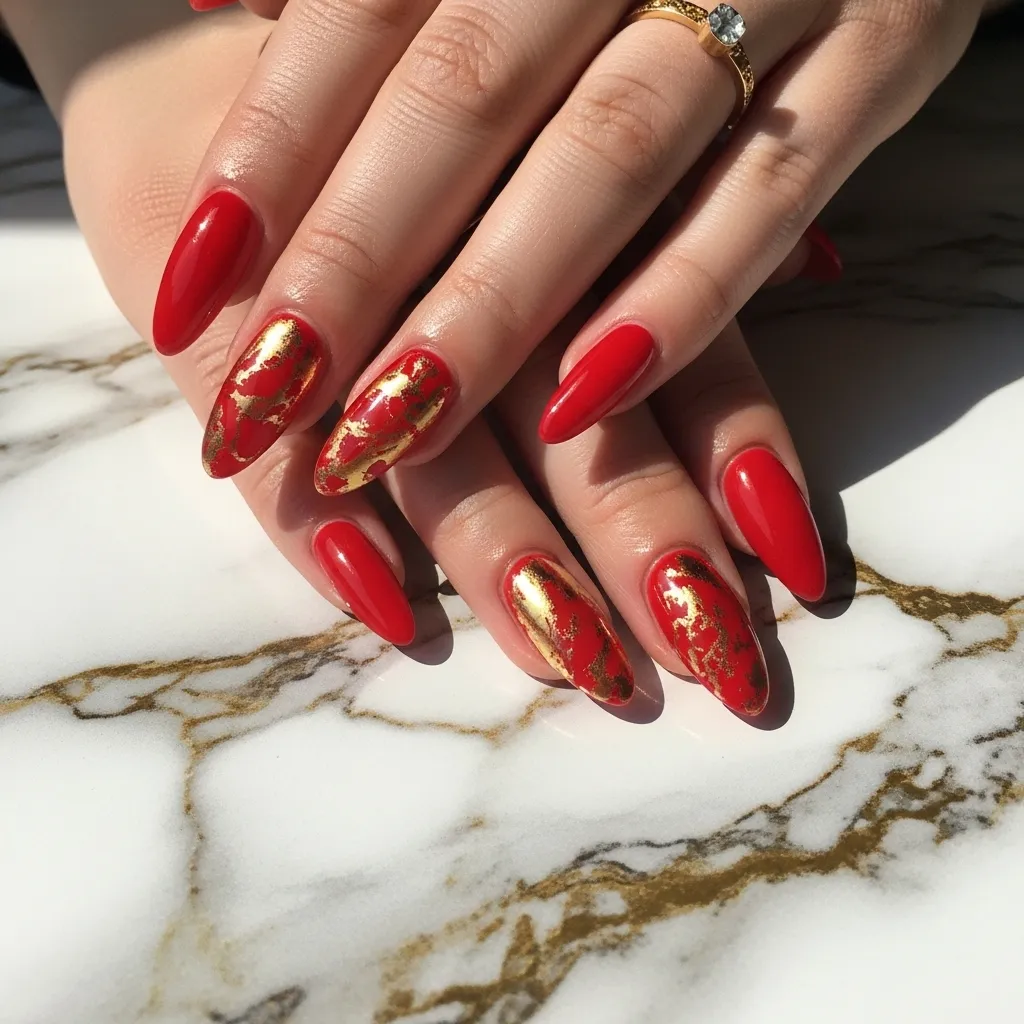 Feeling artistic? A marble effect using red gel and gold foil flakes creates a stunning, one-of-a-kind manicure. It’s like wearing liquid art on your nails.