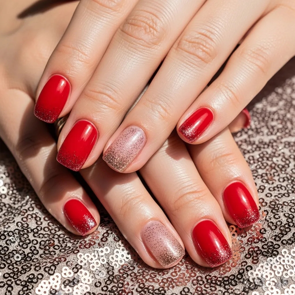 Keep most of your nails a solid, glossy red. Then, on your accent nail (I usually choose the ring finger), ask for a gradient of red glitter fading from the tip.