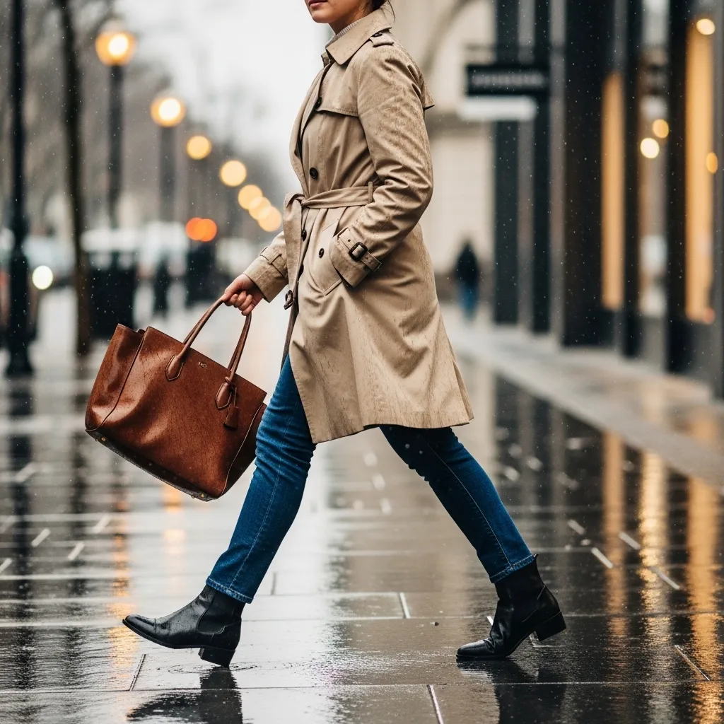 You can never go wrong with this timeless combo. A classic beige trench coat is my first line of defense—it’s water-resistant, effortlessly chic, and goes with everything. I love how it instantly pulls an outfit together.
