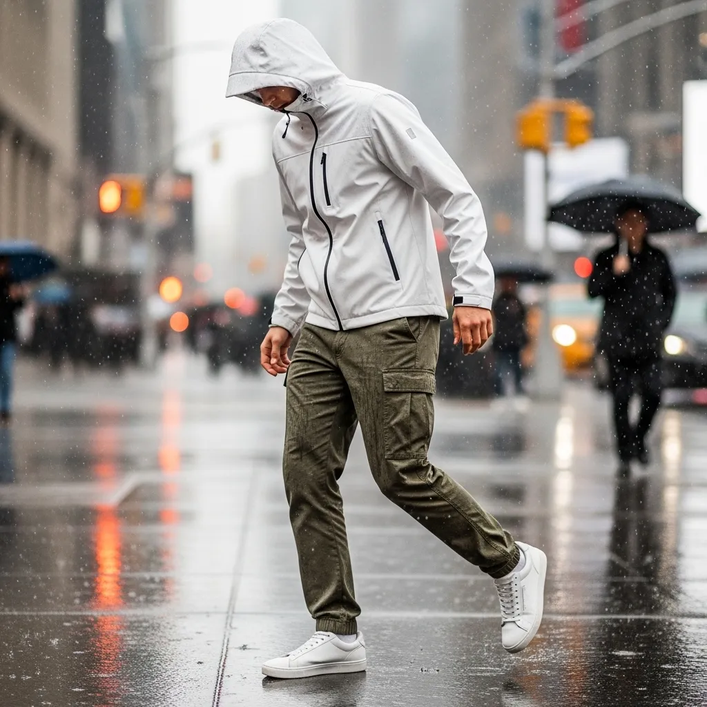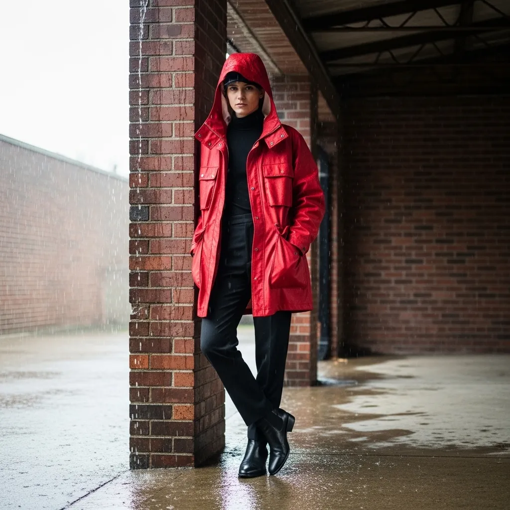 I wear it over high-waisted leggings and a moisture-wicking top. Finish with waterproof sneakers or trail shoes. It’s a sporty, modern look that says you’re ready for anything, from a wet walk to a last-minute grocery run.