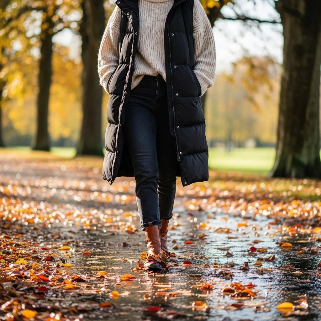 A water-resistant puffer vest is a genius layering piece. A longer line one provides more coverage. I wear it over a chunky knit sweater and a collared shirt peeking out for a preppy touch.