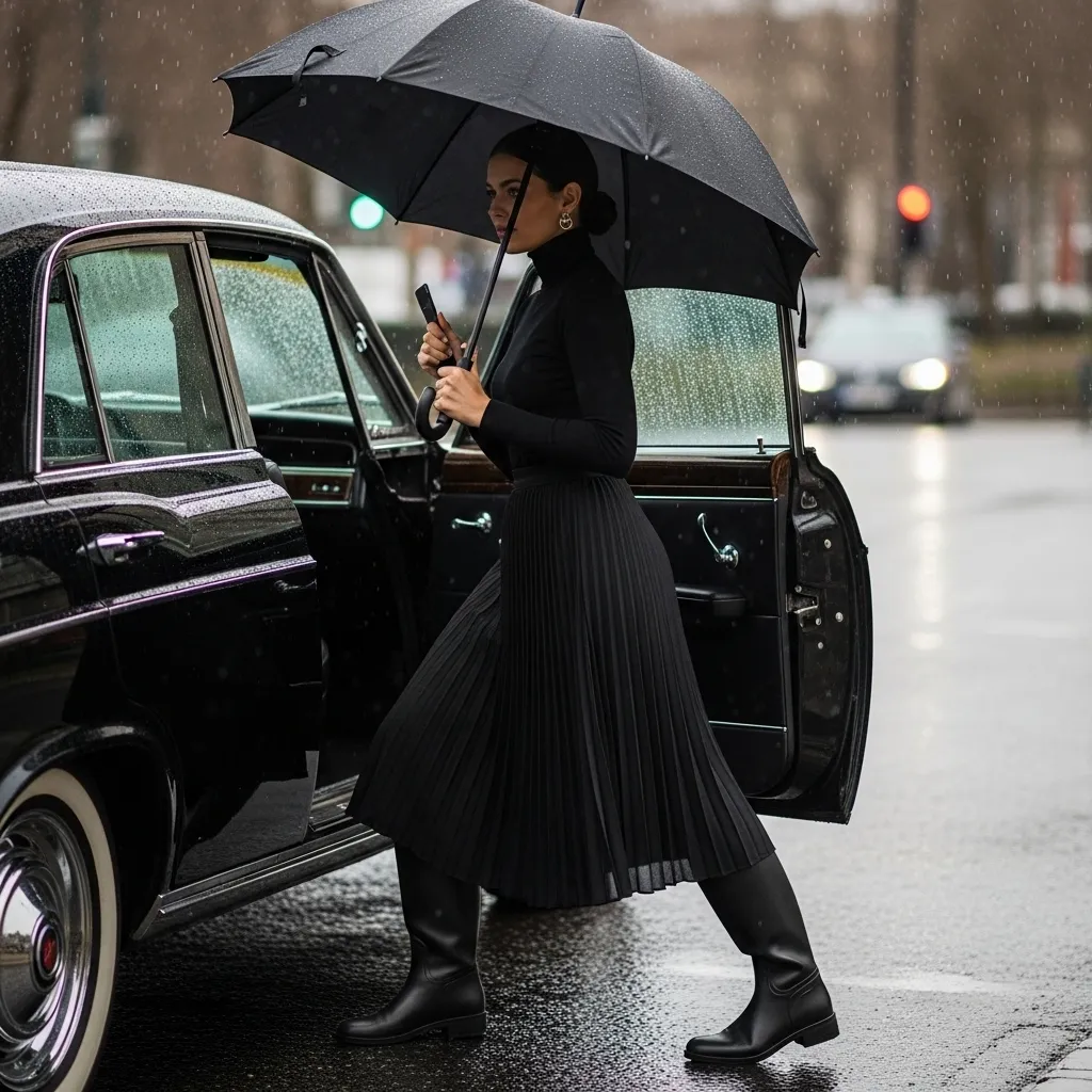 Yes, you can wear a skirt in the rain! A flowy midi skirt paired with sturdy knee-high boots is a dream combo. The boots protect your legs, and the skirt has a lovely, feminine movement.