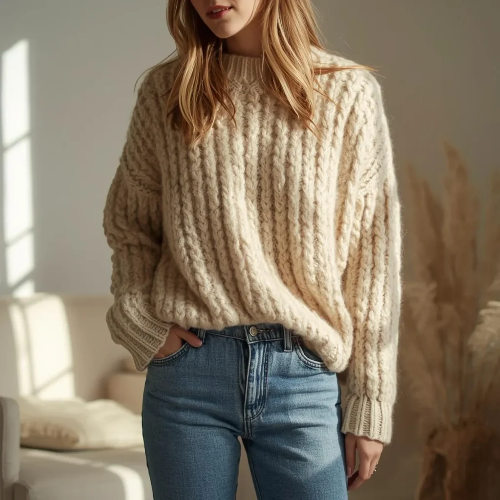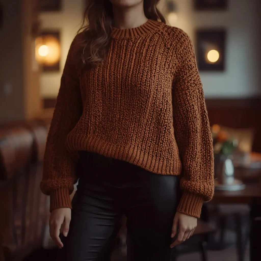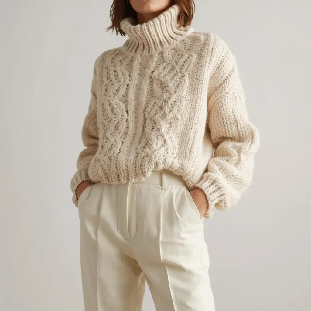 When paired with high-waisted pants, the outfit feels timeless and confident. It’s simple, cozy, and stylish.