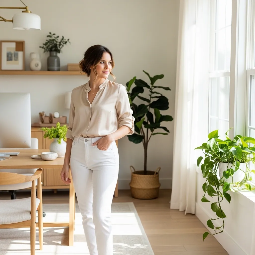 This is my secret weapon for a date night or a girls’ dinner. A silky, printed blouse tucked into white jeans feels so elegant and feminine. I look for pieces with flutter sleeves or a delicate neckline.