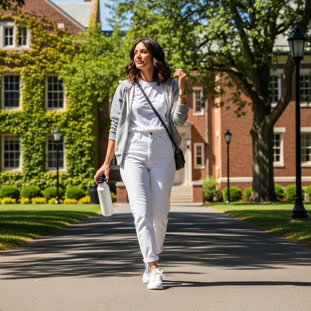 For airport travel or a super casual weekend, I lean into comfort. A sleek, fitted zip-up hoodie in grey or black over a simple tee looks so cool with white jeans.