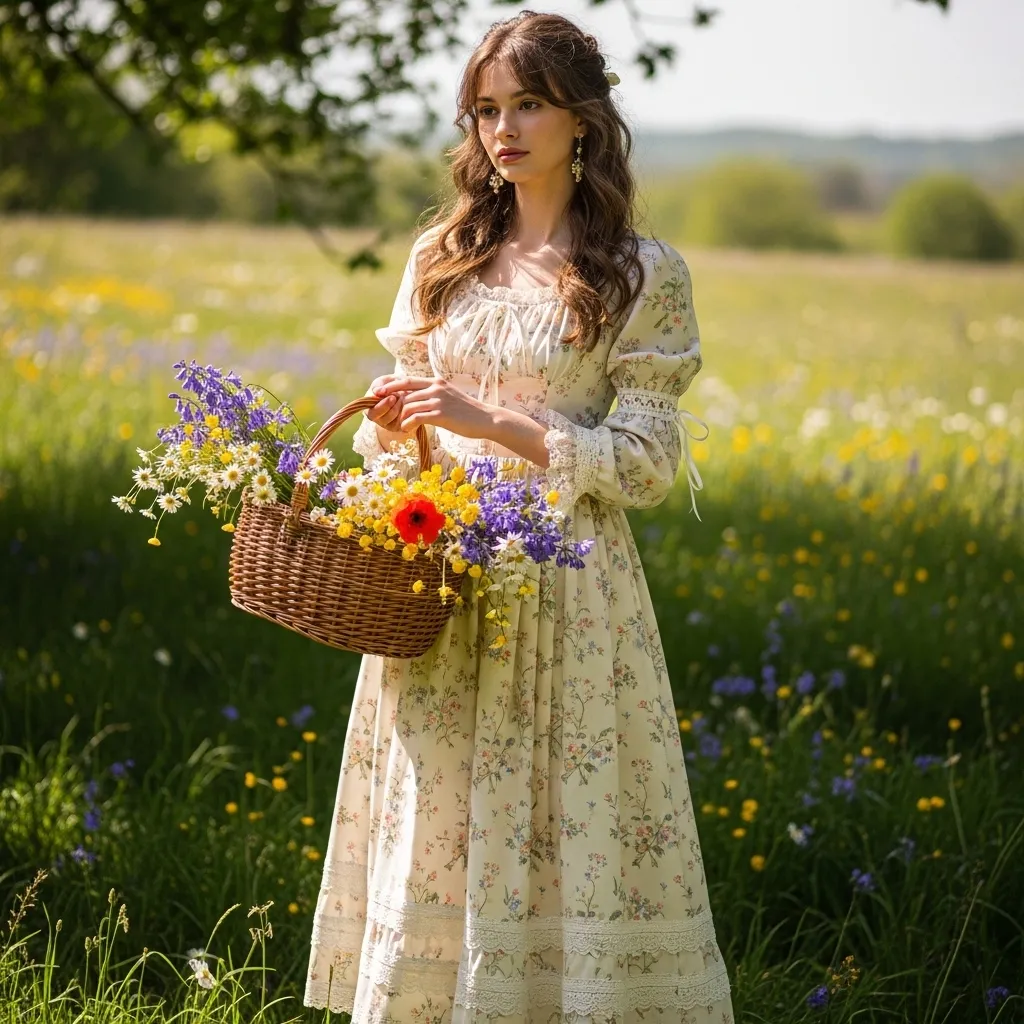 Think puff-sleeve blouses, midi dresses with delicate floral prints, and tiered skirts. The color palette is straight from a sun-drenched garden: cream, sage green, butter yellow, and dusty rose.