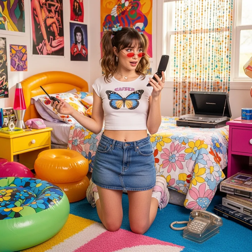 Accessorize with butterfly clips, chunky sneakers, and tiny sunglasses. The key is to embrace the era’s maximalist spirit with a confident smile.