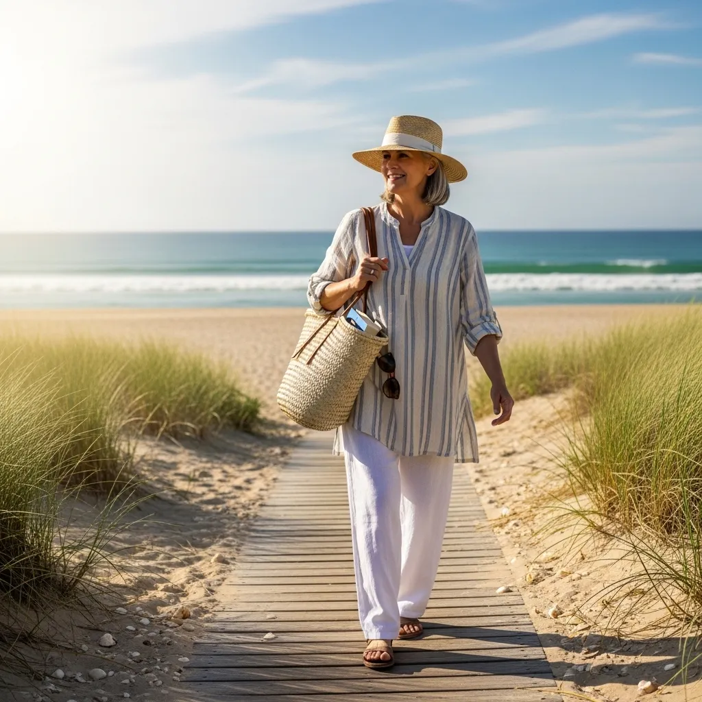Imagine the effortless style of a woman who lives by the sea. This aesthetic is relaxed, elegant, and built on breezy layers and natural textures.