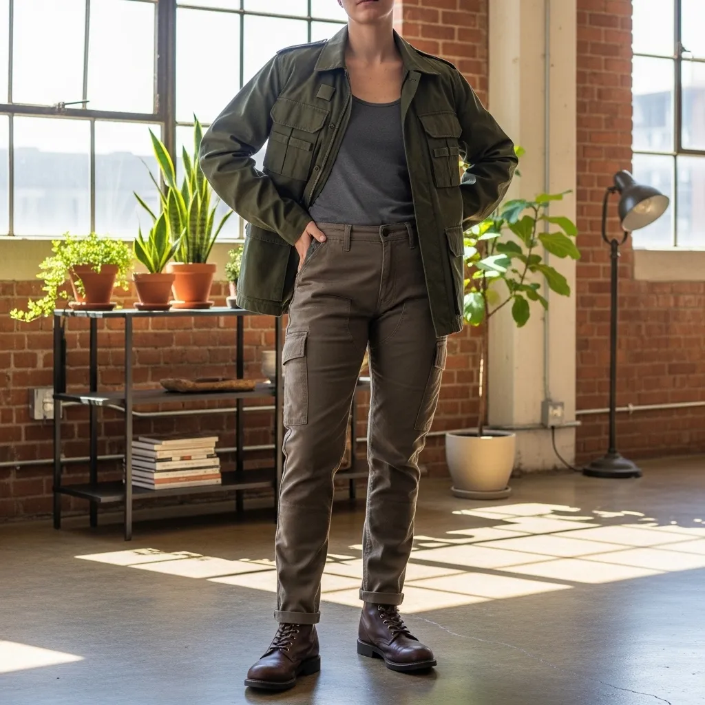 Cargo pants with plenty of pockets, structured jumpsuits, tailored vests, and sturdy boots form the core of this look. Fabrics are durable like canvas, cotton twill, and technical blends.