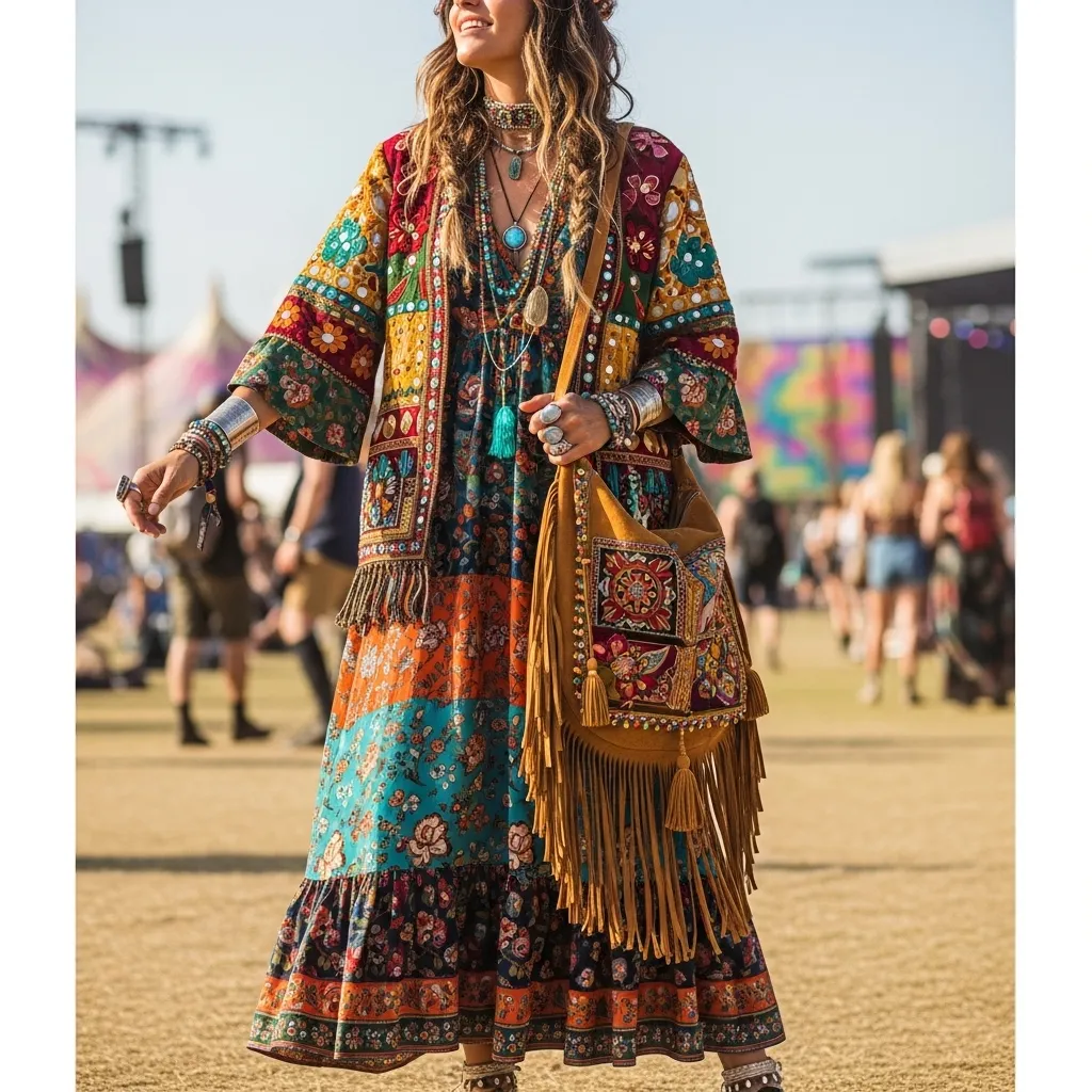 Layer a patterned kimono over a embroidered dress, add stacks of beaded bracelets, and finish with a floppy hat. Embrace fringe, crochet, and paisley prints.