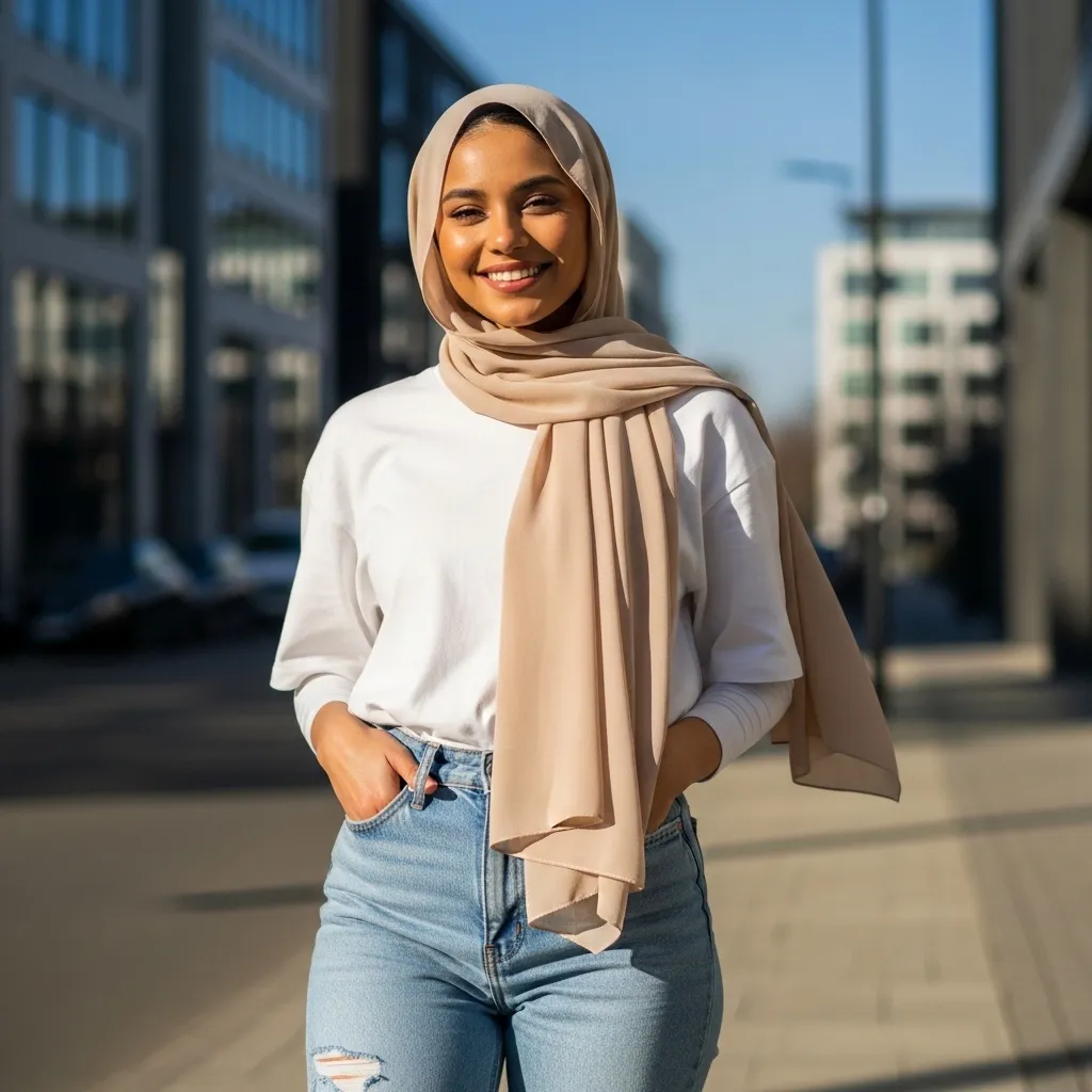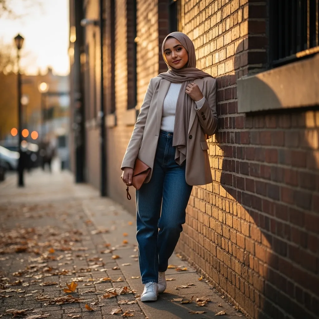 I stick to a monochrome or tonal palette here—think cream sweater with beige trousers, or grey on grey. It creates a long, elegant line. The hijab color can either match for a minimalist effect or pop for a fun contrast.
