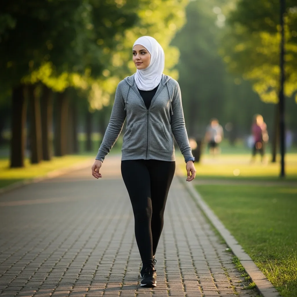 I top it with a long, lightweight sports jacket or an oversized hoodie. A turban-style hijab with a sports underscarf keeps everything secure and comfortable during movement.