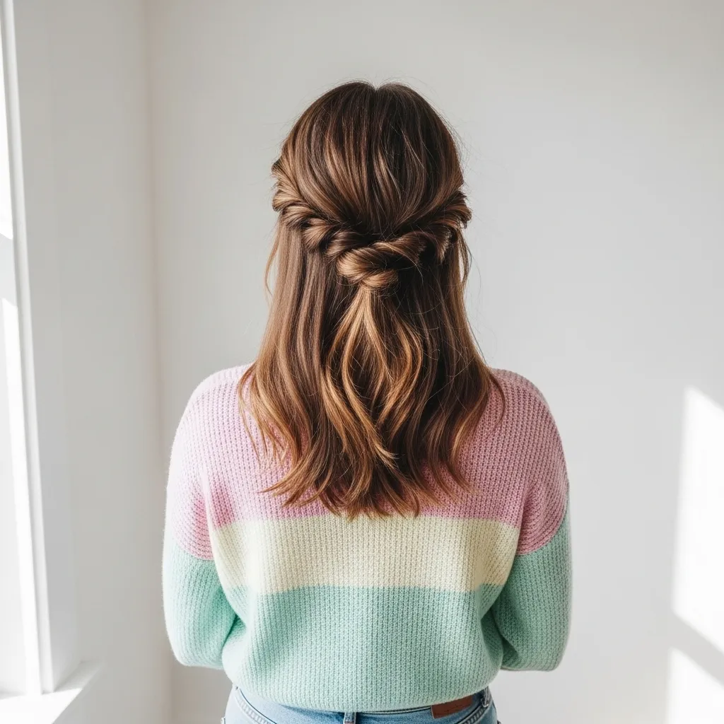 For a fuller look, gently pull on the twists to loosen them. This style keeps hair out of your face while showing off your length. It works on straight, wavy, and curly hair beautifully.