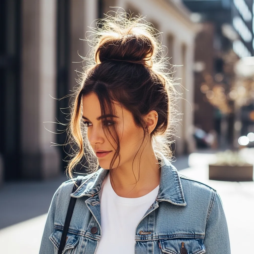 Don’t smooth out the bumps or flyaways—they’re what make it cool. Pull out a few pieces around your neck and temples. Instant “I’m busy and creative” energy.