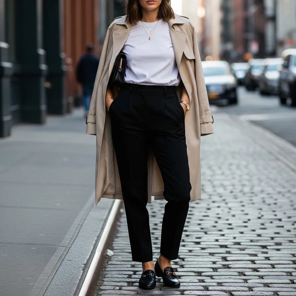 Finish with loafers, a trench coat, and a structured bag. It’s intelligent, classic, and always appropriate.