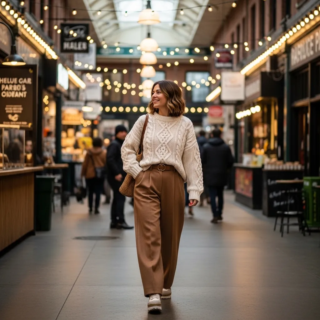 Choose a chunky, interesting knit—cable, ribbed, or with a pop of color. Pair it with fluid, wide-leg trousers in a complementary neutral. The volume on top and bottom is balanced and fashionable.