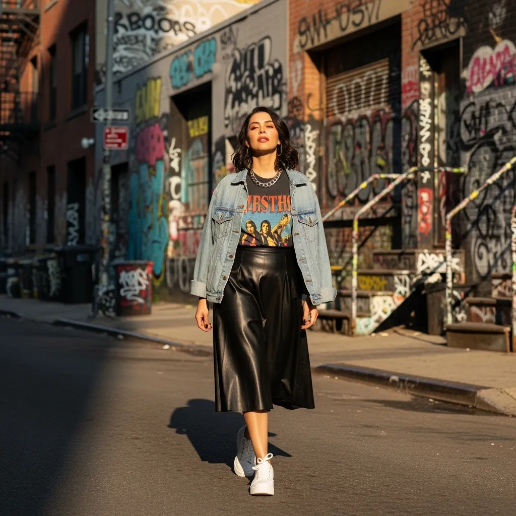 Choose a skirt with character—a slit, a leather panel, or an interesting print. Keep the top simple: a fitted turtleneck or a boxy tee. Then, add your coolest, cleanest pair of white sneakers.