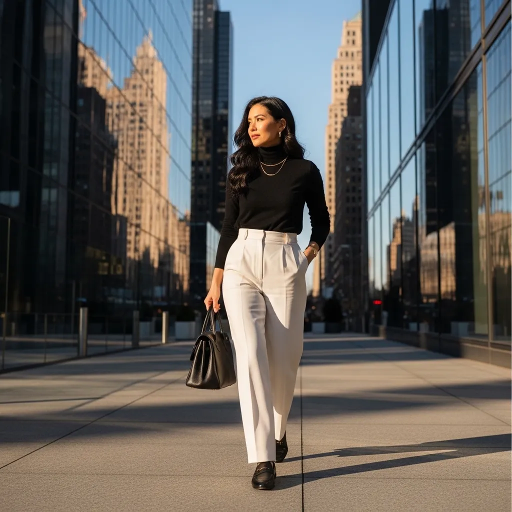 A thin, fitted turtleneck in black, white, or grey is a wardrobe hero. Tuck it into high-waisted, tailored trousers. The silhouette is clean, elongating, and powerful.