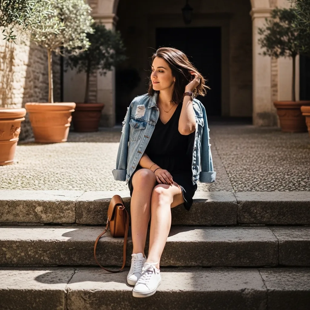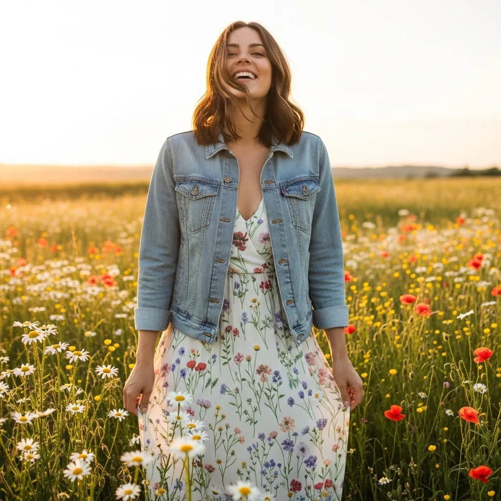 This is my ultimate easy-breezy formula. A floaty floral or simple cotton sundress feels so feminine, and the denim jacket adds just the right amount of casual cool. It balances the sweetness perfectly.