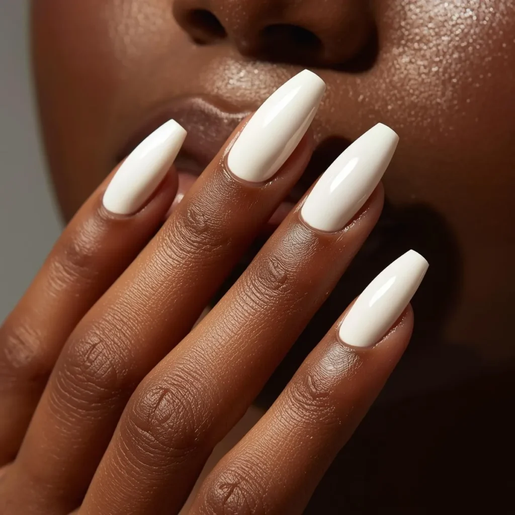Milky white nails create a beautiful contrast on dark skin tone. They look clean, modern, and very chic.
