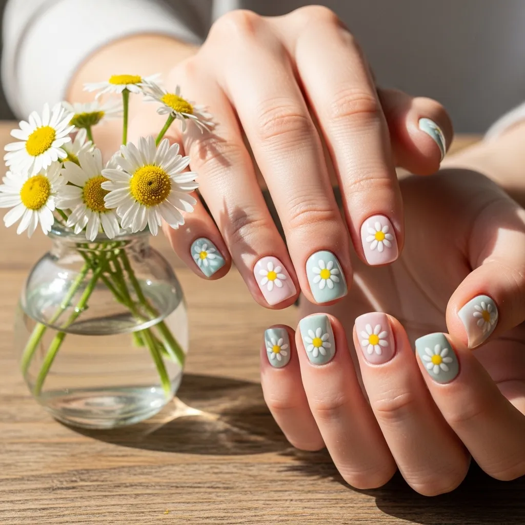 Nothing says spring like a cheerful daisy. This design is surprisingly easy to create. Start with a pastel yellow, sky blue, or mint green base. Then, using a dotting tool or a bobby pin, add white petals with a yellow center.