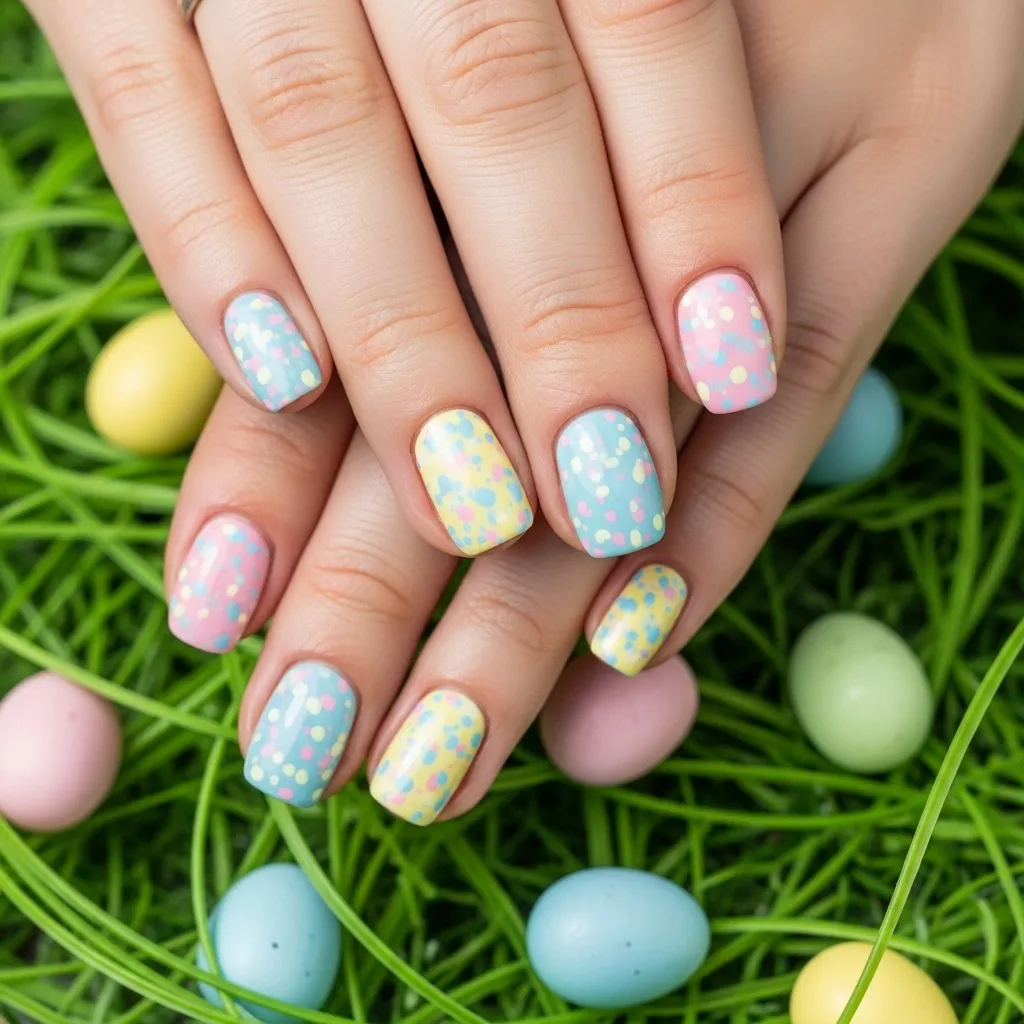 Channel the fun of Easter egg decorating! Paint your nails in a creamy pastel base—think lavender, seafoam, or peach. While the polish is still tacky, gently tap a small brush dipped in a contrasting color to create delicate speckles.