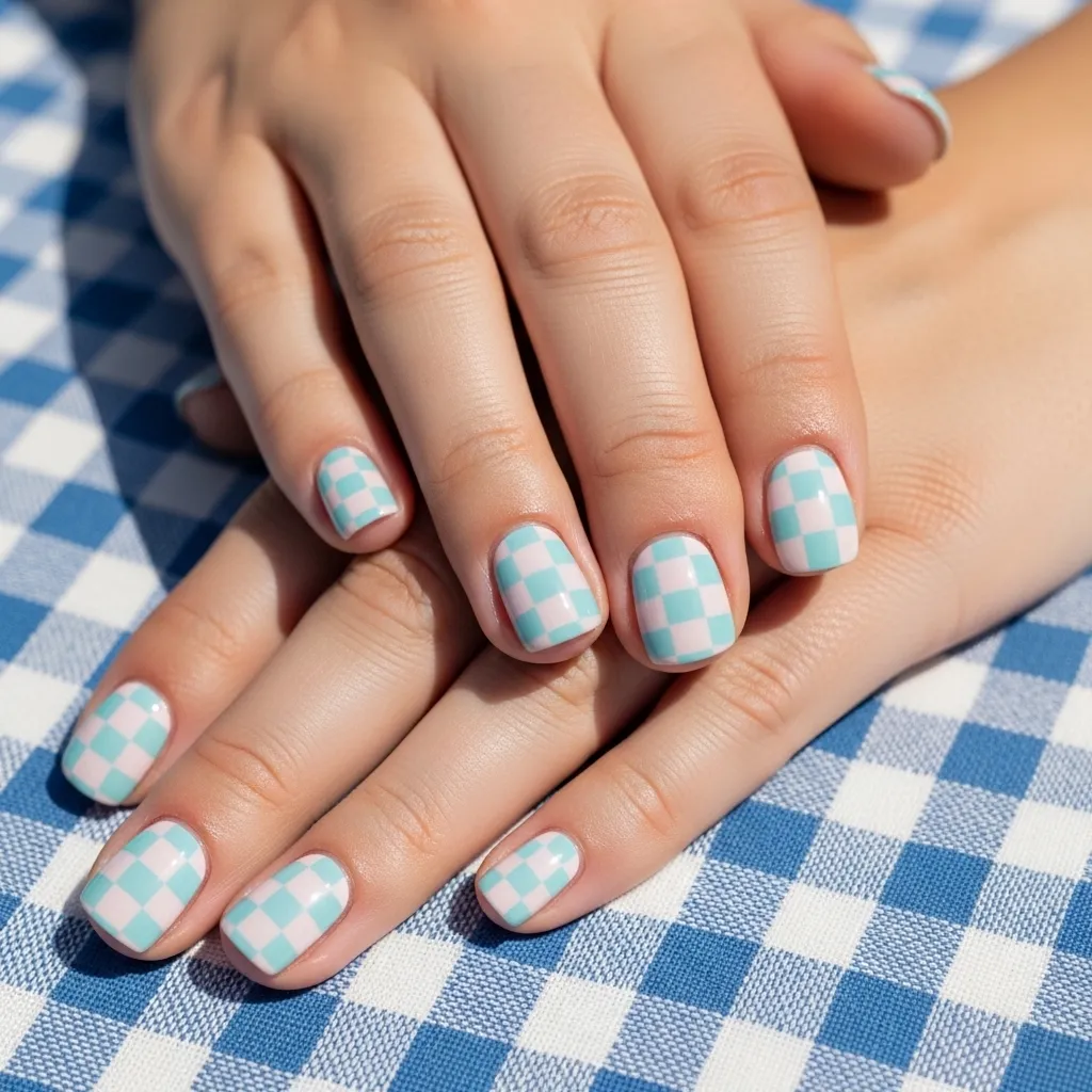 This retro pattern is having a major moment, and it’s adorable in a spring palette. Paint your nails with a light base color. Then, using a thin brush or nail art stickers, create a small checkered pattern using two contrasting pastels, like baby blue and pink.