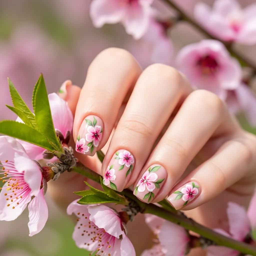 Warm, creamy peach is a stunning neutral for spring. It’s flattering and feels luxurious. To embody the “blossom” theme, add small hand-painted pink blossoms with a brown branch detail on a nail or two.