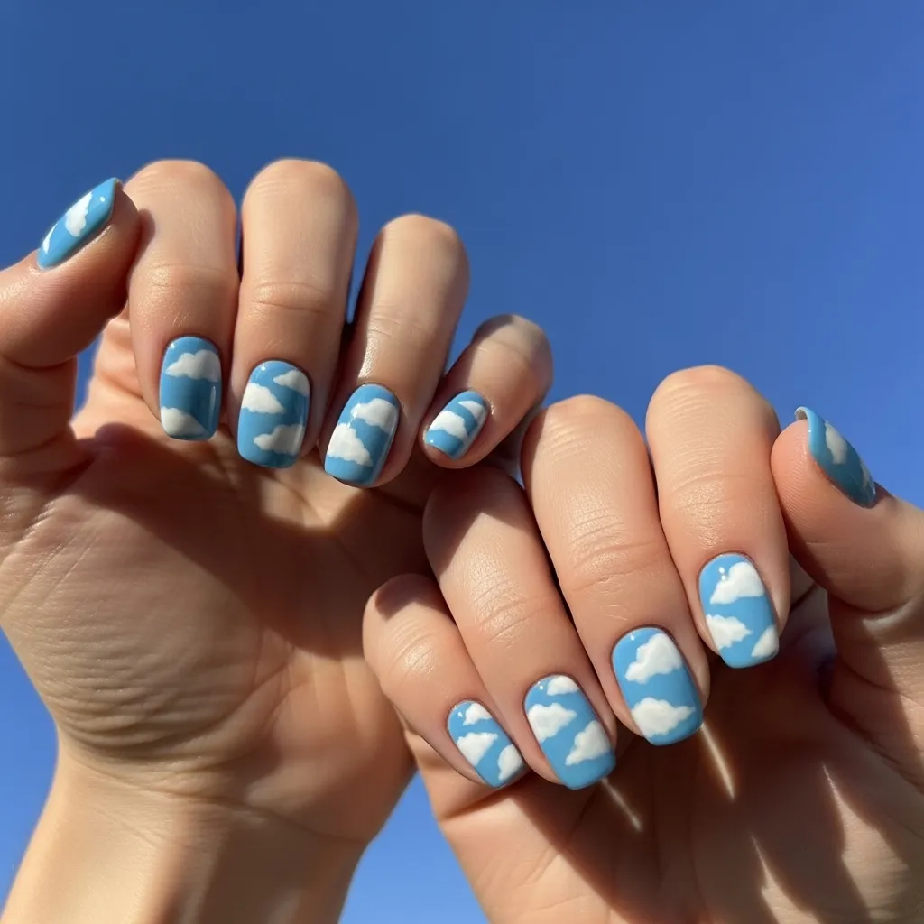It’s a whimsical, dreamy design that’s simpler to create than it looks. A glossy top coat makes the blue look even more sky-like.