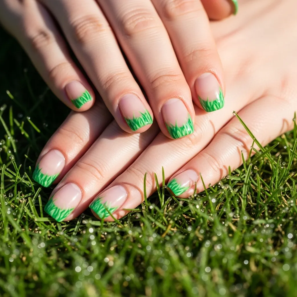 This is a fun take on the French manicure. Instead of a straight line, paint your tips in a vibrant grass green. Then, using a detail brush, create tiny upward strokes to mimic blades of grass.