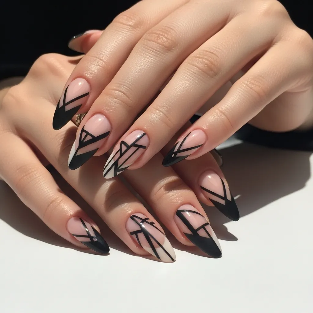 Use striping tape to get those sharp edges, or a tiny brush for freehand shapes. Pair a nude base with black geometric accents for high contrast. It’s edgy, architectural, and so cool.