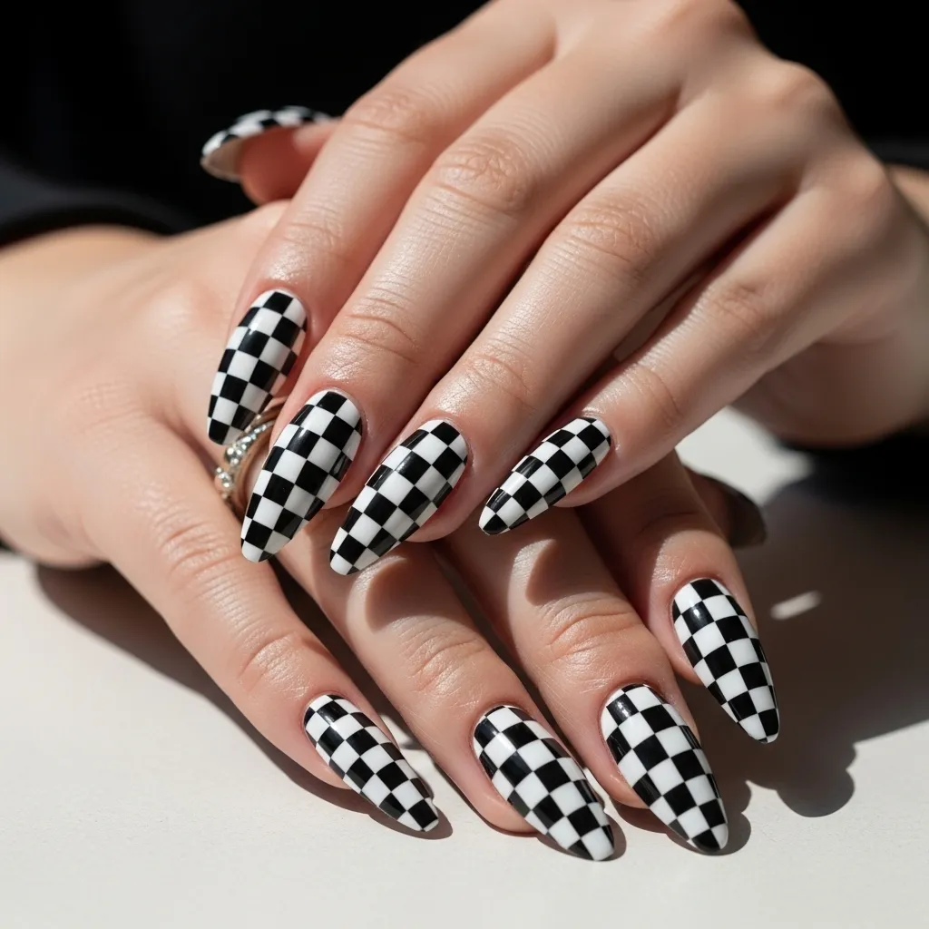 Channel some retro fun! A classic black and white checkerboard pattern is bold, graphic, and instantly eye-catching. You don’t have to do every nail—try it as an accent on your ring fingers against solid black or white nails.