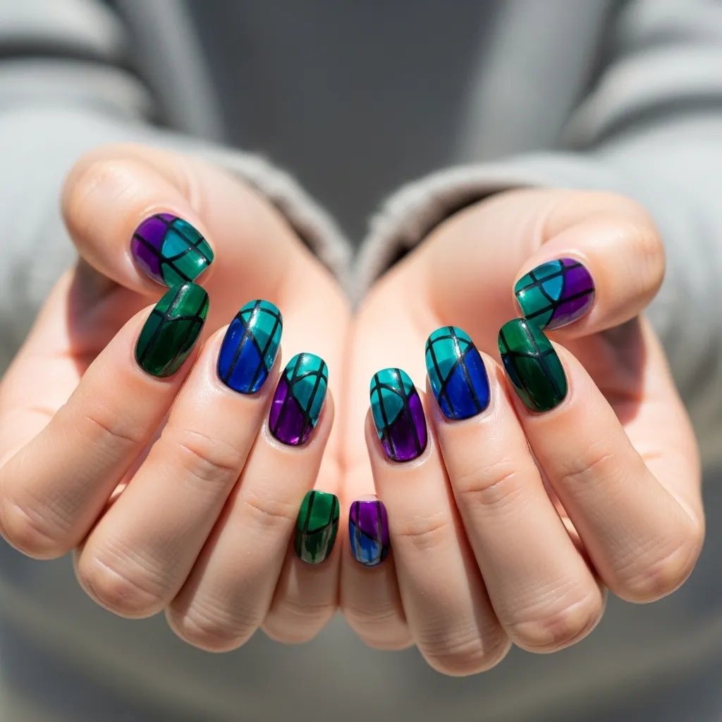 This design is pure magic. Imagine deep, vibrant colors like sapphire, ruby, and emerald outlined in thin black lines, mimicking the look of stained glass windows. It’s rich, dramatic, and full of color.