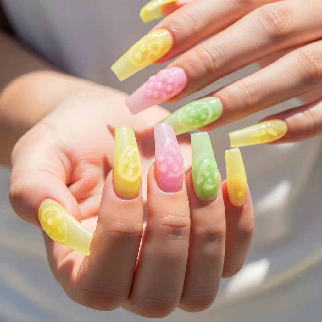 This is the sweetest, most playful look. Think bright, candy-colored nails in shades like cherry red, lemon yellow, and lime green, all topped with a glossy, jelly-like top coat that makes them look juicy and translucent.