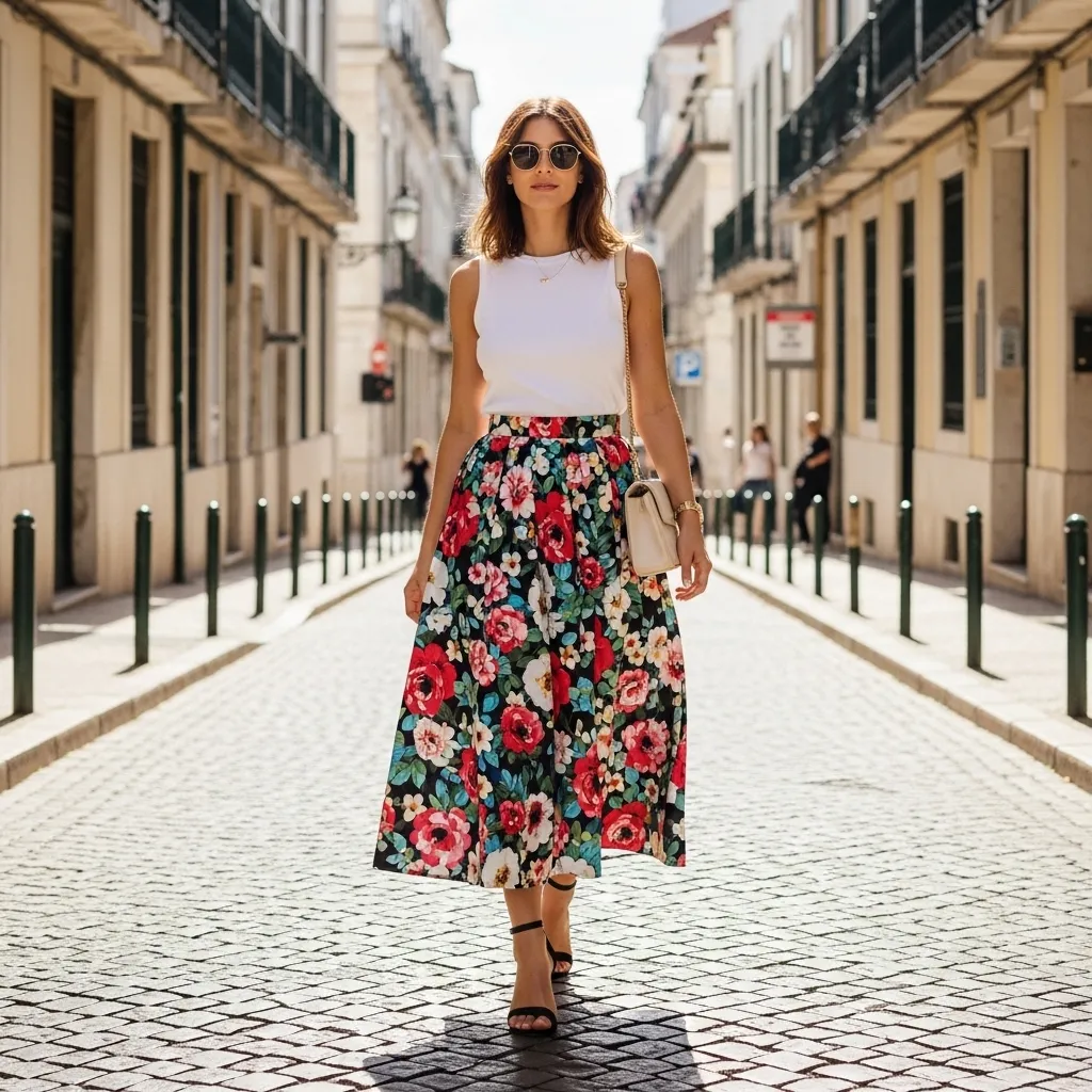 I keep the top half simple—a plain white tee or a fitted black tank balances the look perfectly. It’s an outfit that feels special and photogenic, yet is incredibly comfortable to wear all day.