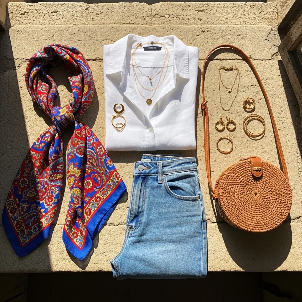 This isn’t a single outfit, but the most important style rule I follow. A simple tee and jeans becomes European with a “third piece”—a lightweight scarf, a linen blazer, a statement belt, or an interesting hat.