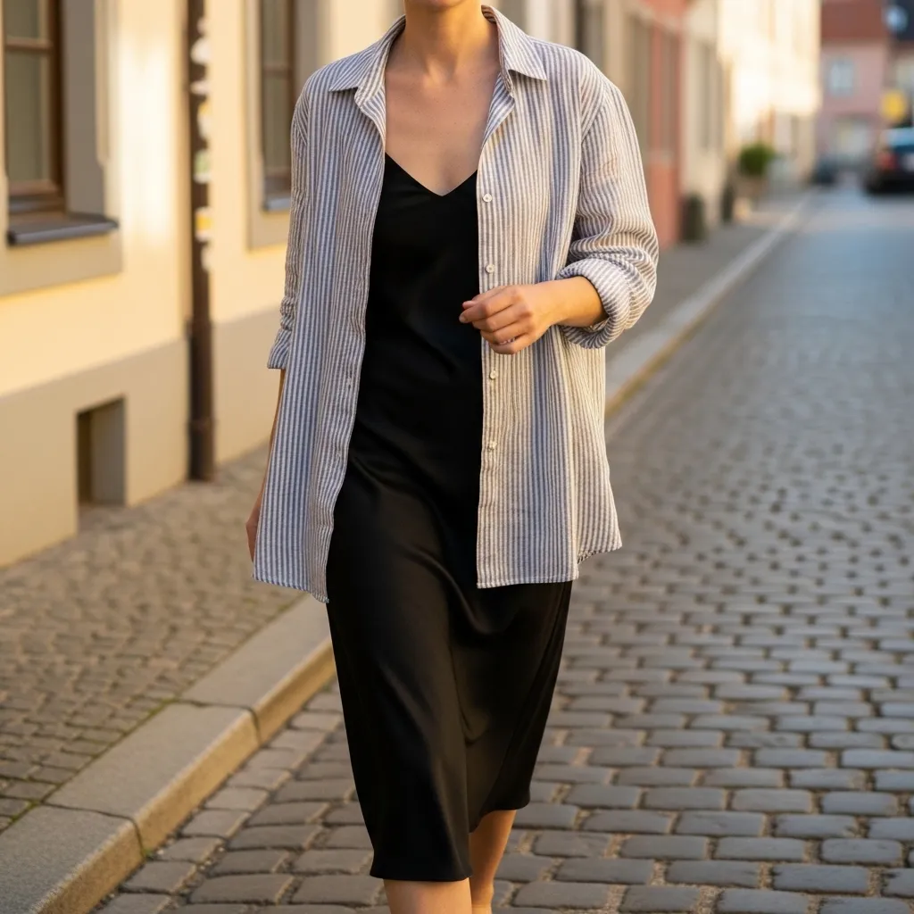 For a touch of feminine edge, layer your oversized shirt unbuttoned over a silky slip dress. The contrast between the structured cotton and the delicate slip is everything. It adds coverage and a cool, relaxed layer to a dress that can sometimes feel too dressed up.